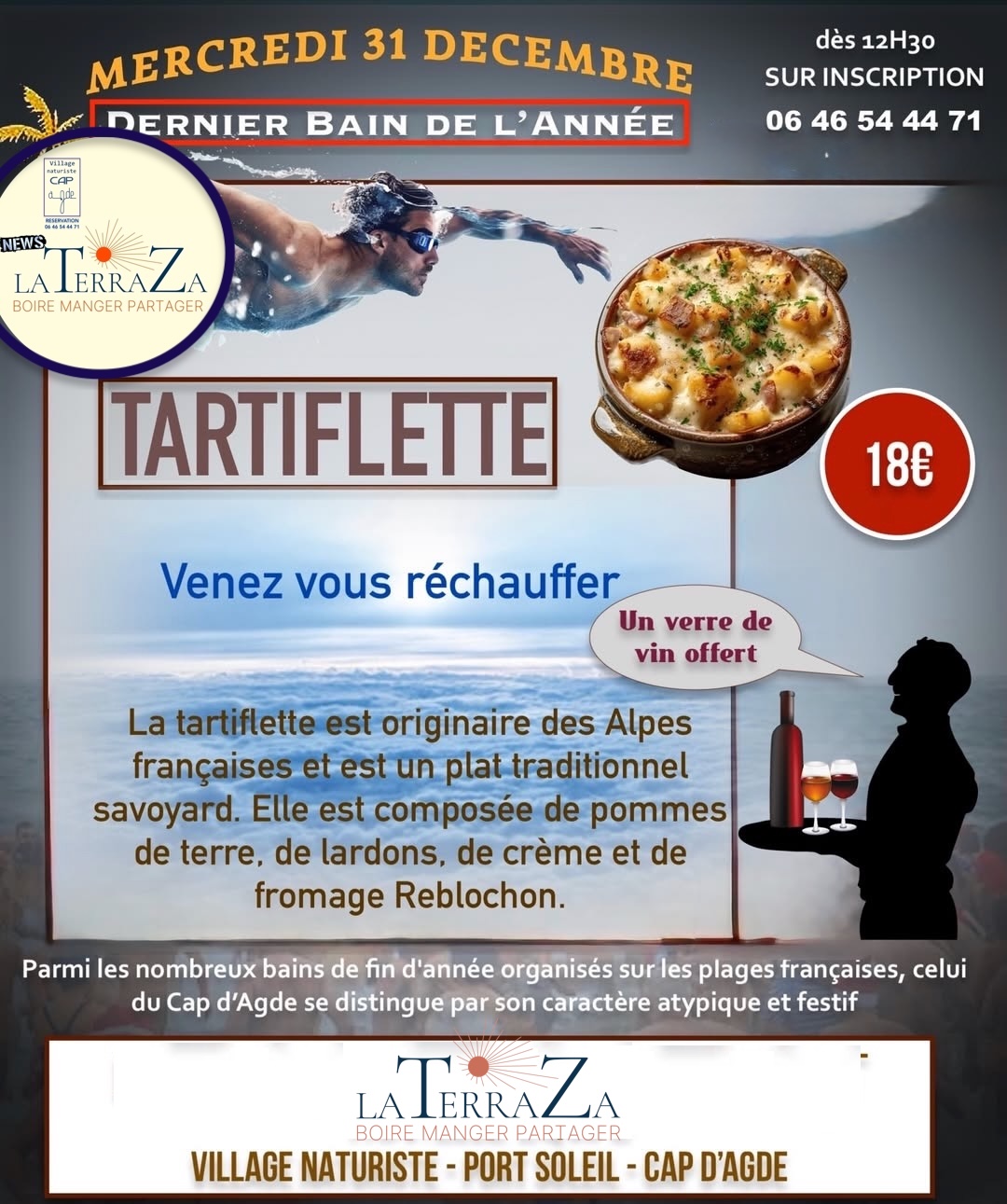 Dernier bain de l’année, dernière folie gourmande ! À La Terraza - Cap d'Agde – Port Soleil, réchauffez-vous avec une tartiflette généreuse façon savoyarde : pommes de terre fondantes, lardons dorés, oignons confits et reblochon coulant à souhait… Après le bain, place au plaisir.