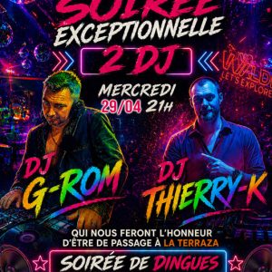 La Terraza : Mix DJ LIVESoirée exceptionnelle !!! 2 DJ vous feront passer une soirée dingue : DJ thierry-K & DJ G-Rom Pensez a réserver : 06 46 54 44 71 29 Avr21h00 Village Naturiste